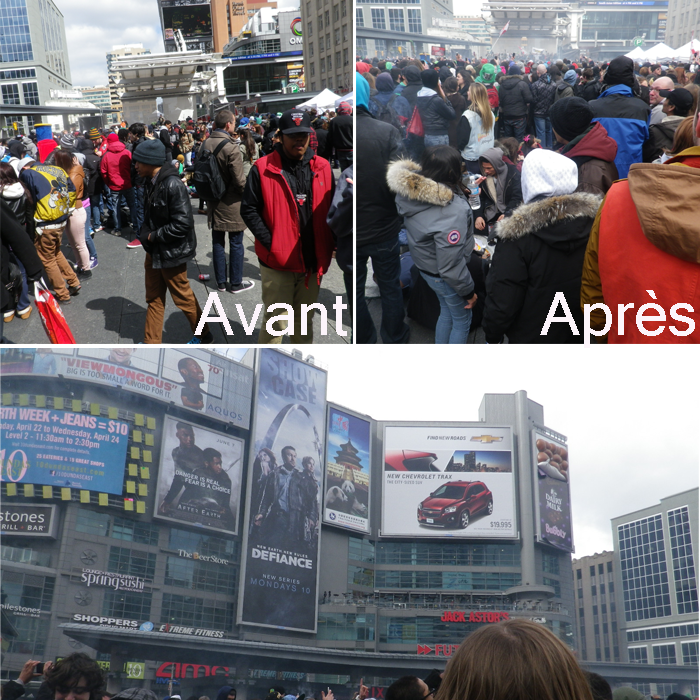 Samedi : Journée « 420 », une journée où fumer du « pot » (cannabis) dans la rue était totalement légale au Canada. Rendez-vous sur Dundas Square à 15h00. Assez troublant de voir la place recouverte par un nuage de fumée. L’expérience sera renouvelée pour l’événement mondial du 11 mai. Pour le décompte, c’est ici : http://globalmarijuanamarch.ca/