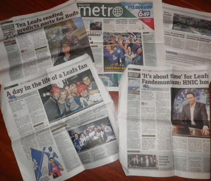 Plus intéressant et captivant que le base ball reste le hockey. En plein play-off actuellement, Toronto se bat activement pour éliminer Boston. La ville est décorée en bleu et l’ambiance les soirs de match est ahurissante. Une populace massive s’agglutine sur Maple Leafs Square, à l’extérieur du Air Canada Centre, pour suivre en direct le match. Lorsque ce que ce dernier est à domicile, l’ambiance est tout simplement électrique. La foule est habillée/déguisée en bleu et blanc et scande à tue-tête « Go, leafs go ». Même la presse consacre une page quotidienne aux Maple Leafs et à leurs fans.