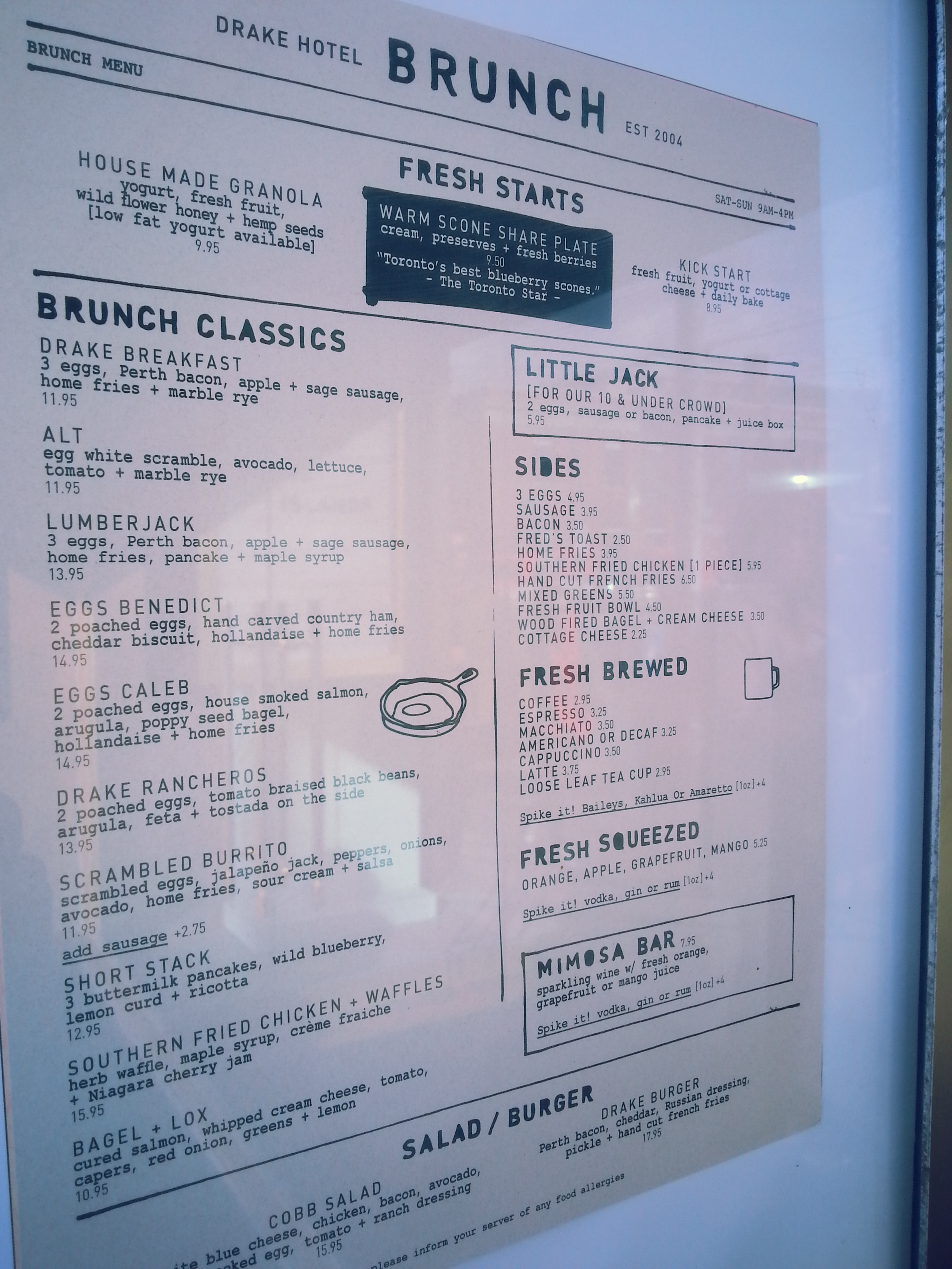 Le prix reste correct pour un brunch ($20 avec les taxes pour mon assiette et les tasses de café), mais il faut noter que l’on paie surtout la localisation et la popularité du Drake.