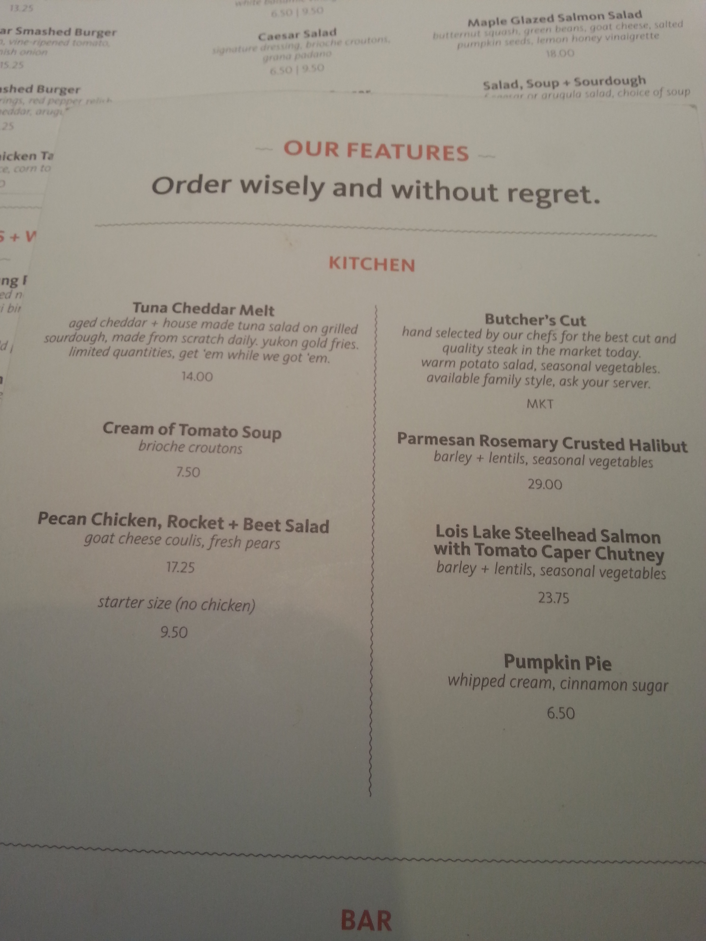 L’Allemagne étant un de ces pays chers à mon coeur, le nom, l’offre, et l’agencement de la place (on se croirait dans une cave) m’ont plu. Le lieu était assez calme (est-ce parce que nous approchons du froid canadien? ou bien car nous sommes venus un soir de semaine?) et bien étudié pour permettre aux clients de s’entendre (au propre comme au figuré).