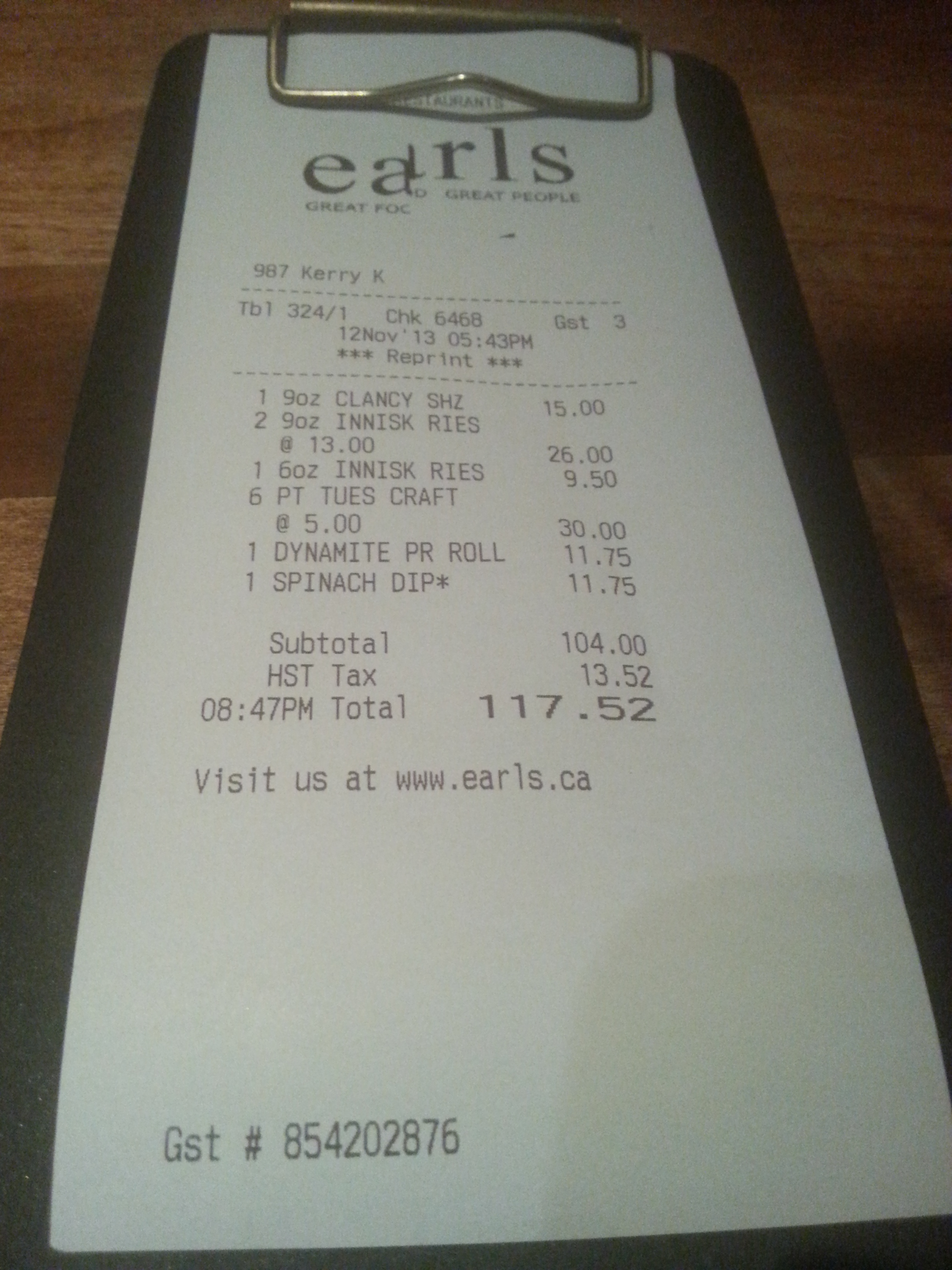 On voulait, à l’origine, tester les burgers qui sont « LA » spécialité de « The Earls » mais notre choix s’est finalement porté sur les sushis et l’appetizer de 3 toppings: de « vrais » morceaux de pain (très semblables à de la baguette fraîchement coupés) accompagnés d’un mélange d’artichauds, épinards et fromage. SO DELICIOUS.